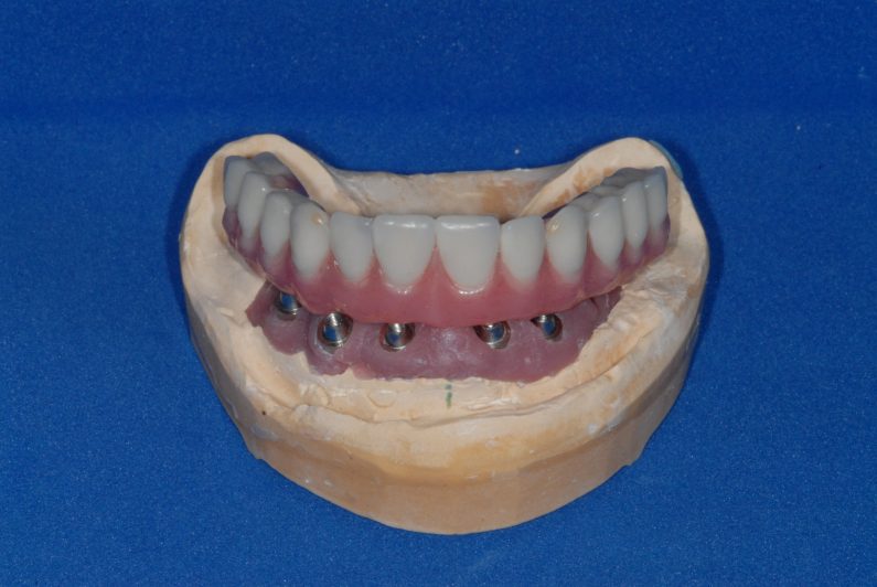 שיקום על גבי שתלים: שתל הוא תחליף לשורש השן. השתל מוכנס לעצם הלסת, שם הוא מעוגן ומשמש כתחליף לשורש השן. שיקום על גבי שתלים יכול להיות נשלף או קבוע. בשיקום קבוע על השתל יש לבנות את השיקום אשר מקנה לו תפקוד ומראה של שן. בניה זו נעשית על ידי מבנה המוברג אל השתל וכתר. את השיקום הקבוע על גבי השתל ניתן לעשות רק כשלושה עד שישה חודשים מזמן ההשתלה.